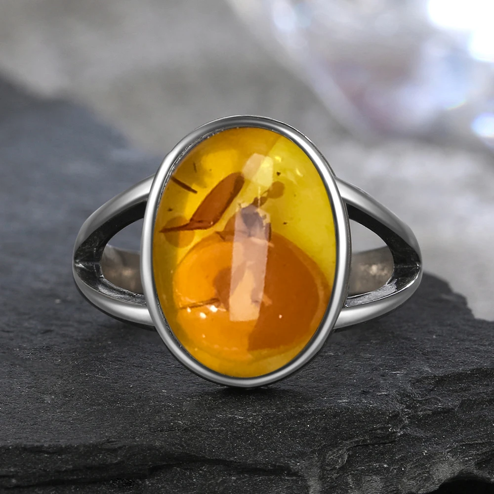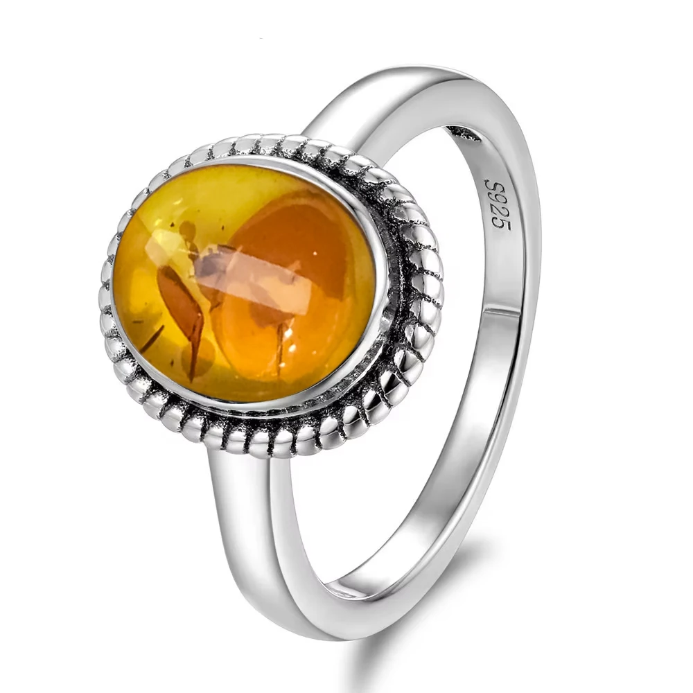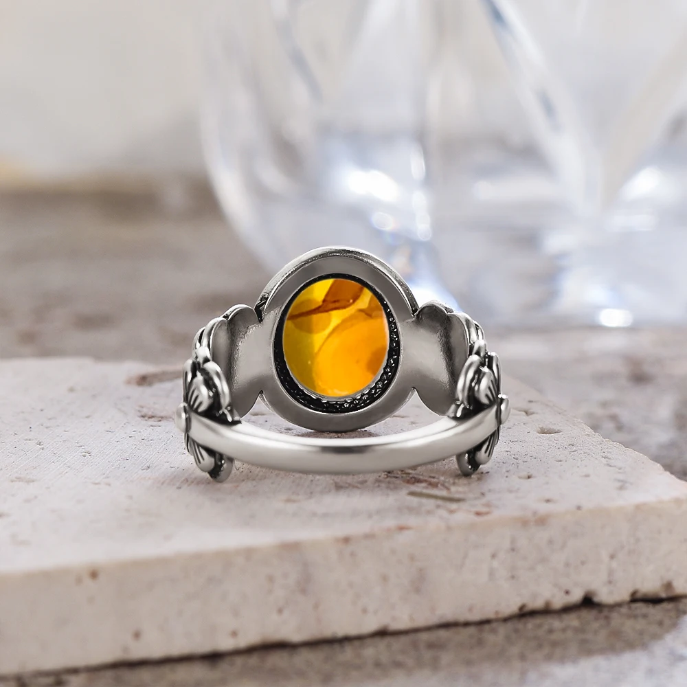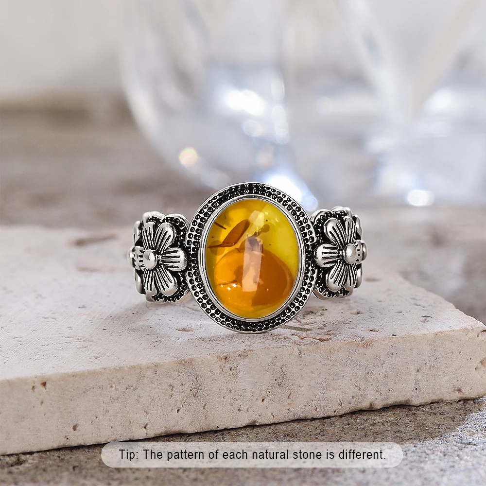 L'ambre est l'une des pierres les plus précieuses et les plus mystérieuses au monde — une résine fossilisée vieille de millions d'années qui emprisonne en elle la chaleur dorée du soleil tropical. Associée à l'argent sterling 925 certifié, elle donne naissance à cette bague fleur vintage d'une beauté rare et intemporelle.