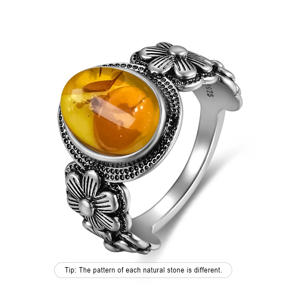 Argent 925 certifié · Pierre d'ambre naturelle · Design fleur vintage · 4.8/5 · Unisexe · Tailles 6-10
